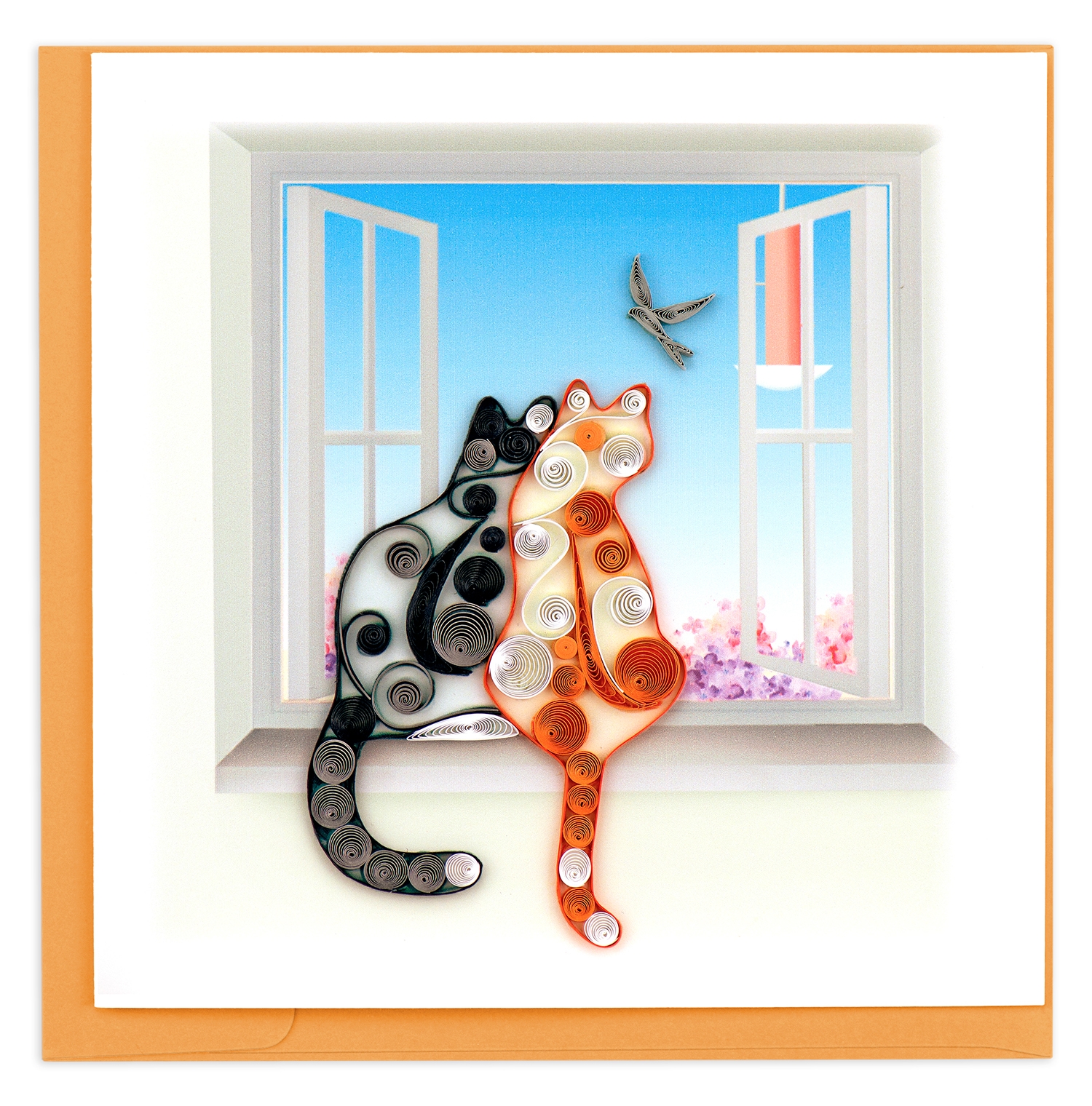 This card is perfect for the cat lover in your life! The design features a black cat and an orange cat sitting on a window sill with the windows open with a black bird flying through a blue sky in the background.