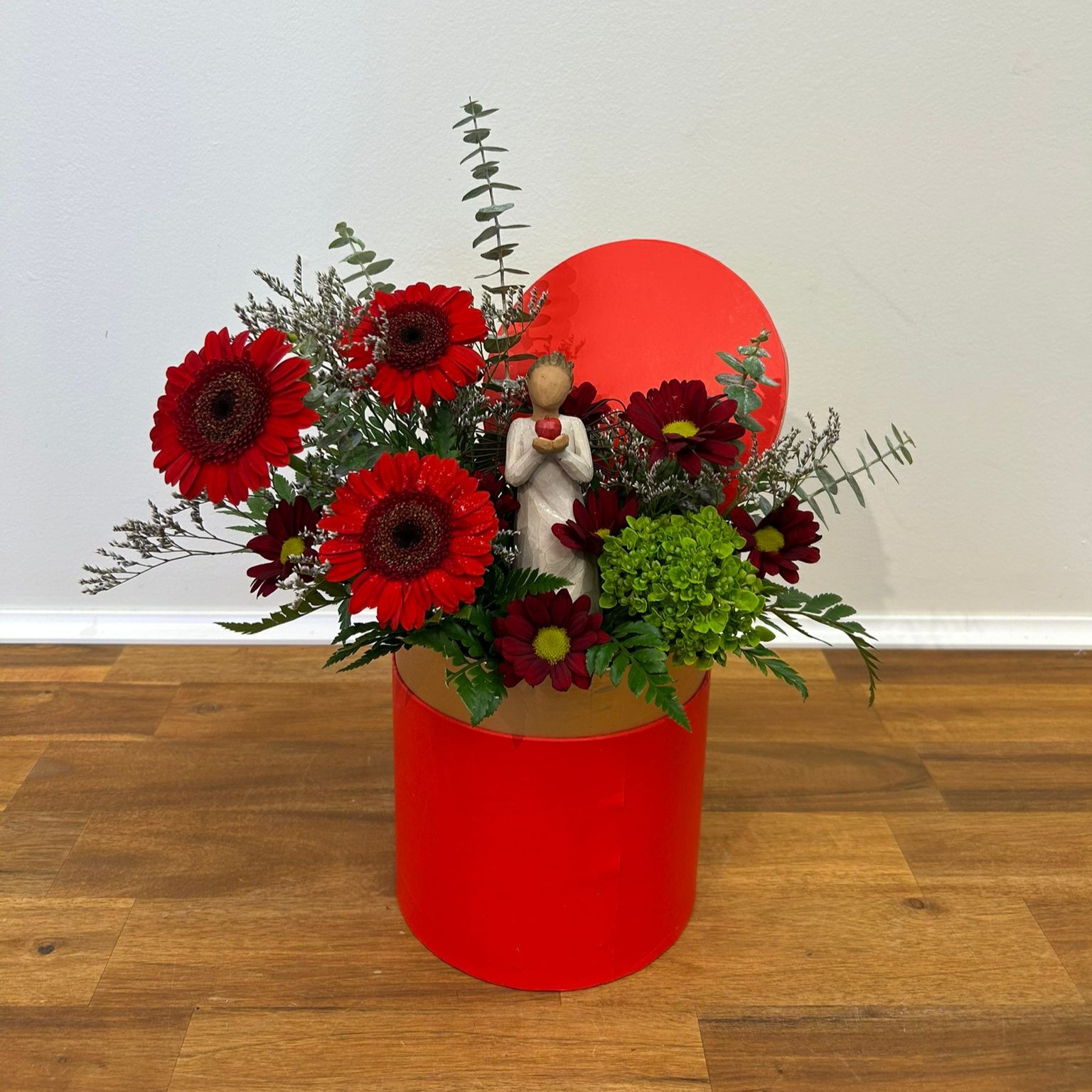 Arranged in a bold red hatbox, this piece makes a meaningful gift for memorials, religious celebrations, or to honor a loved one with beauty and reverence.
