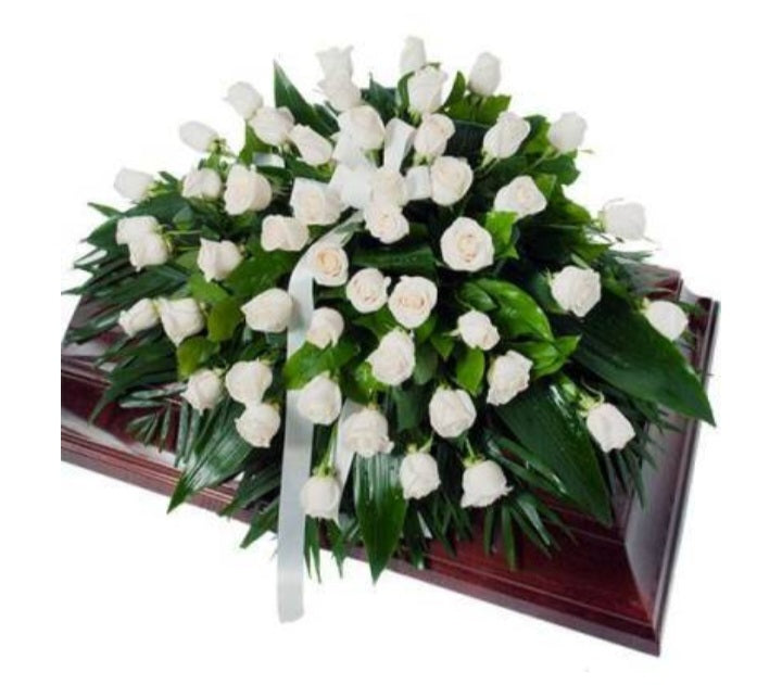 A beautifully traditional casket arrangement created with 60 of our freshest white roses and greens. This tribute is classic and tasteful - the perfect way to celebrate a loved one’s life.