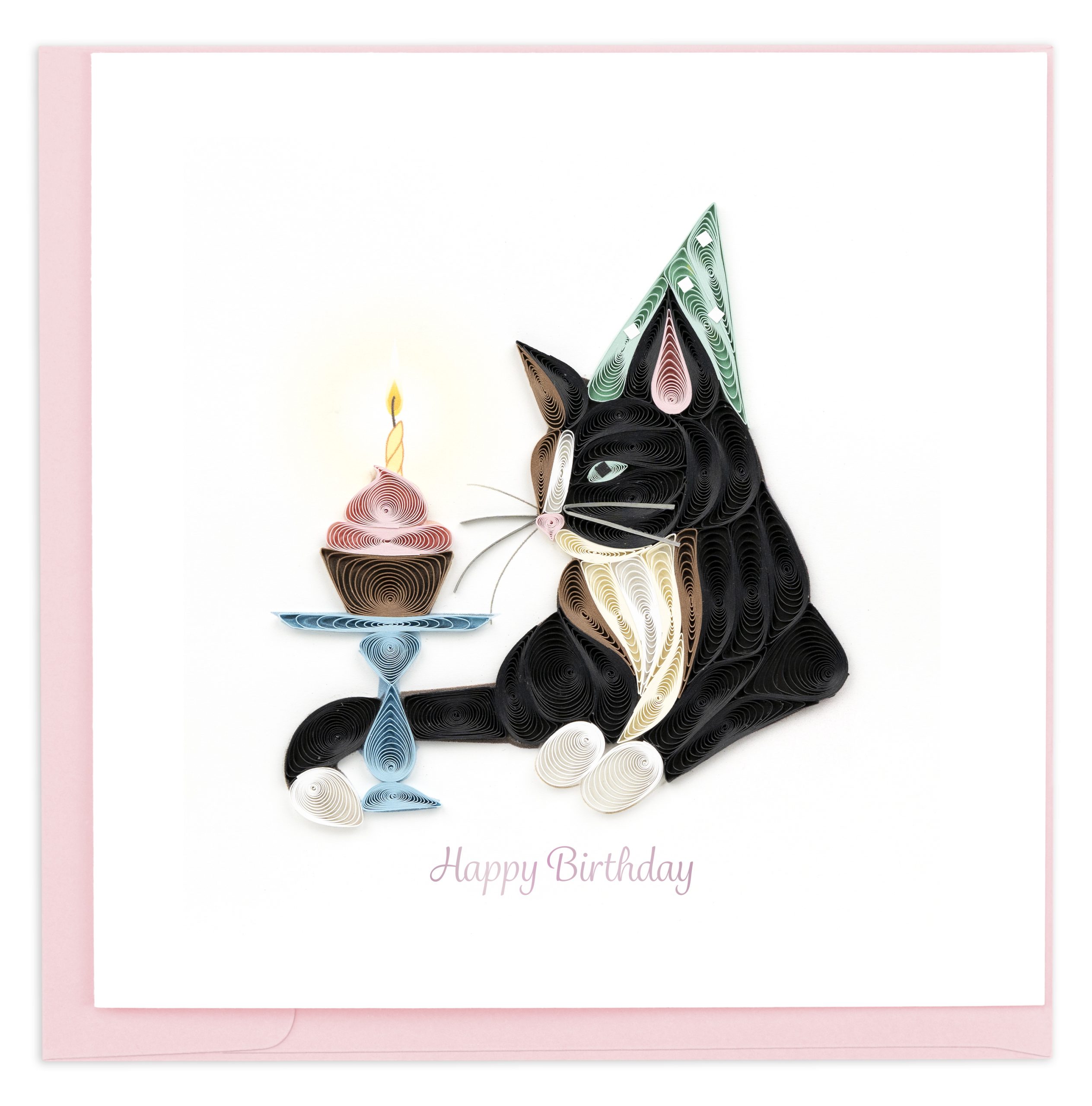 The purr-fect handmade birthday card for a cat lover! With a quilled party hat and cupcake this fine feline is ready to celebrate.