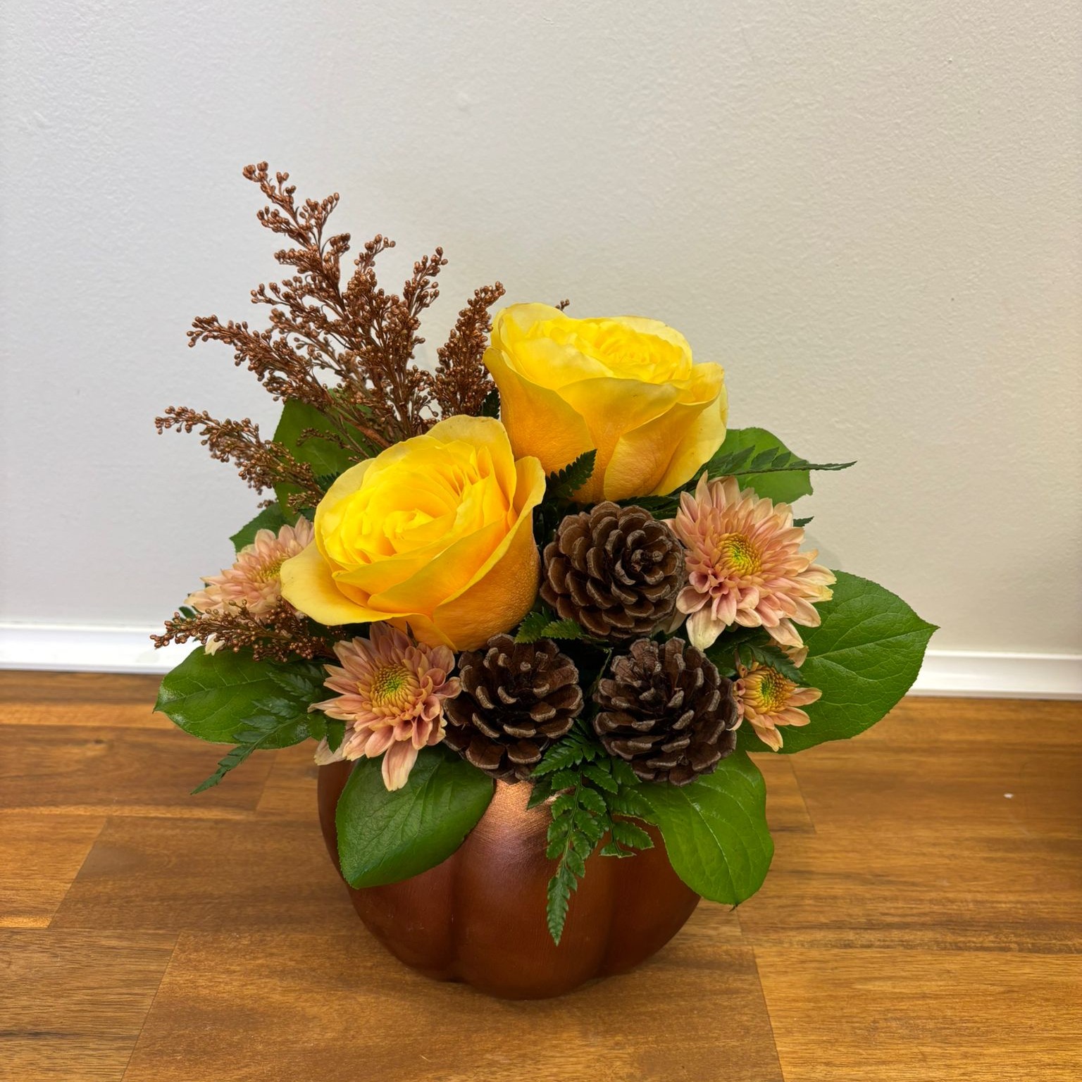 Bright, cheerful, and perfectly autumn. This seasonal design features radiant yellow roses paired with warm-toned chrysanthemums, rustic pinecones, and textured fall accents. Arranged in a copper pumpkin vase, it brings together the beauty of autumn harvest with a touch of elegance. Ideal as a centerpiece, gift, or seasonal décor, this arrangement adds warmth and charm to any space.