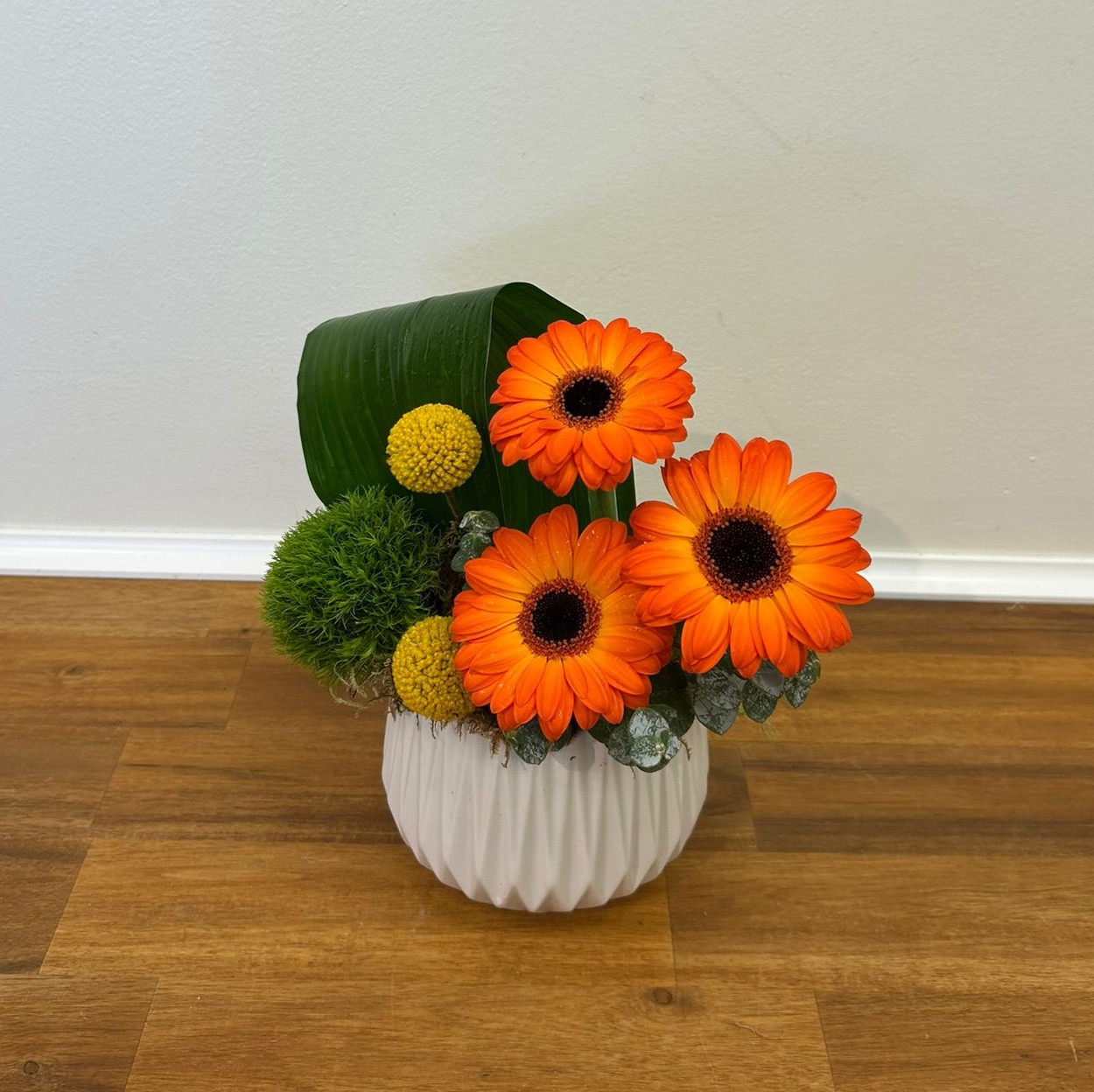 Fresh, bright, and full of zest — this modern arrangement bursts with cheerful orange gerbera daisies, sunny yellow billy balls, and vibrant green moss. Styled with a bold tropical leaf and nestled in a chic white ceramic vase, “Citrus” brings a refreshing pop of color and energy to any space.