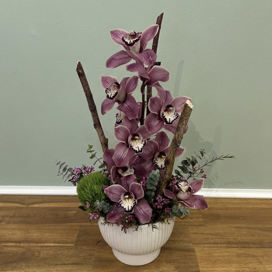 This striking sculptural piece features a majestic vertical display of premium cymbidium orchids in a rich, dusty plum. Intertwined with natural, birch branches and grounded by a plush mound of vibrant forest moss, this arrangement brings an organic, high-design aesthetic to any space.