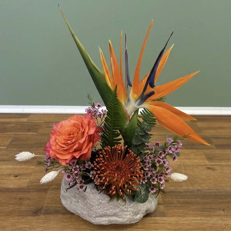A striking study in texture and form, this arrangement pairs the sharp, regal lines of exotic flora with the raw, grounded appeal of a stone-inspired vessel. It is a bold, modern choice for those who view floral design as a form of sculptural art.