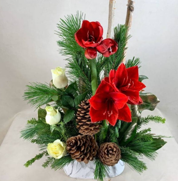 This rustic creation with velvety amaryllis and snowy white roses, scented pines, birch bark sticks and pinecones is arranged in a woodsy ceramic container. Bring the feeling of the outdoors home with the beautiful piece! Just as beautiful as Lake Louise Hill Top.