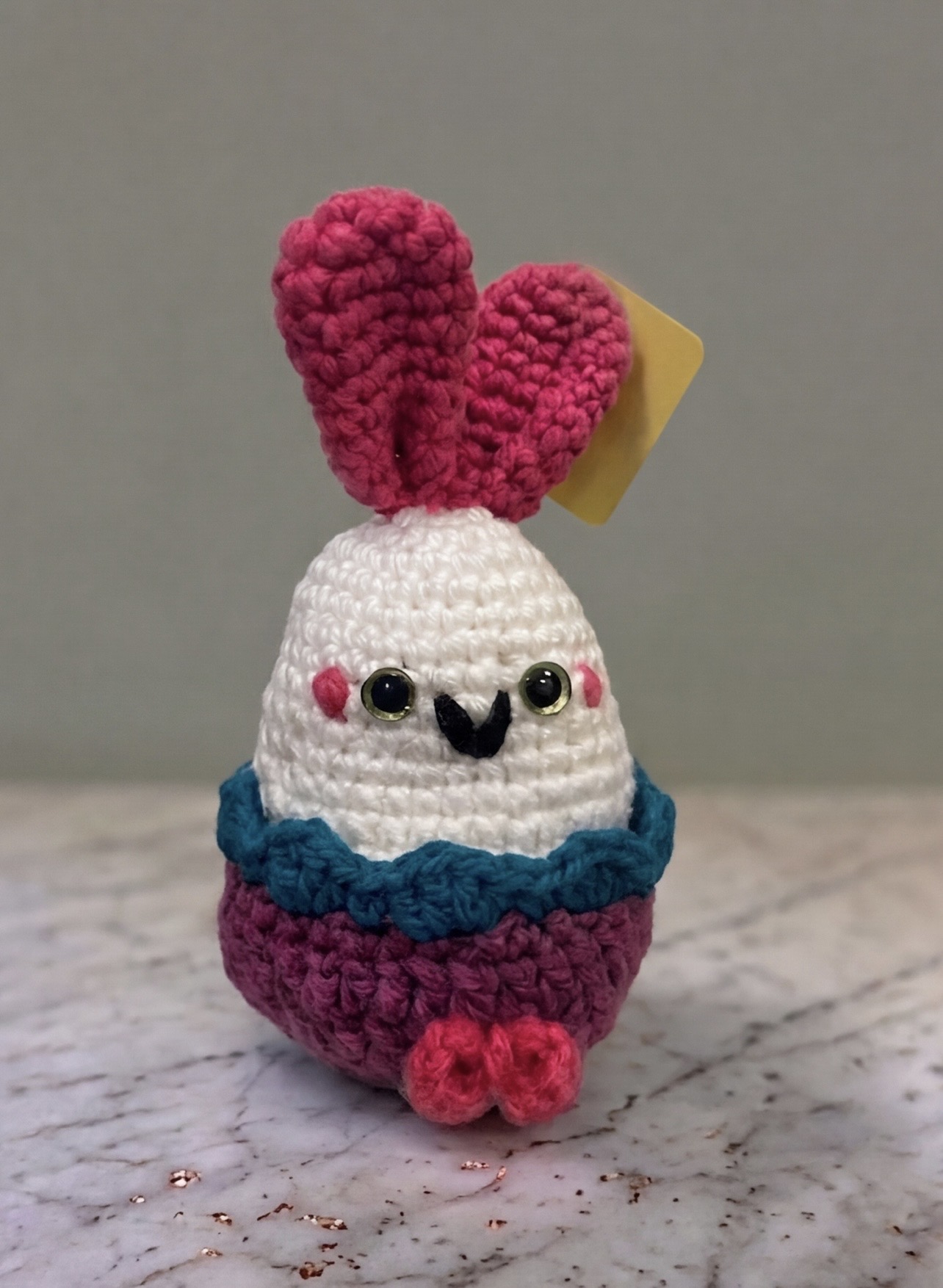 Looking for a unique addition to a spring gift basket? Our handcrafted crochet bunny is the ultimate crowd-pleaser. Compact, durable, and undeniably cute, it features shimmering eyes and playful pop of colour. Whether it's a desk buddy or a nursery accent, this little sprout is ready to bring a smile to anyone's face.