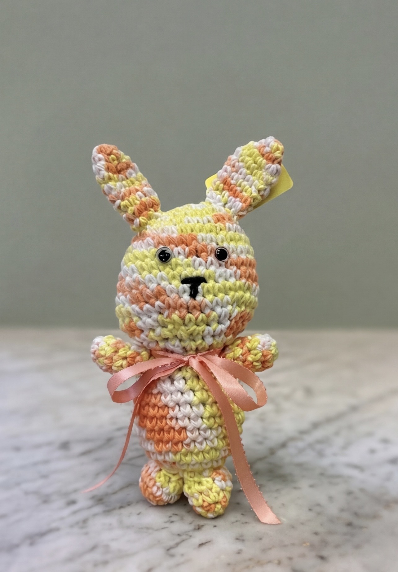 This handcrafted crochet companion is a burst of warmth and texture, designed to bring a touch of artisanal charm to any space. Each stitch captures a playful rhythm of citrus oranges, buttery yellows, and crisp whites, creating a variegated "calico" effect that ensures no two bunnies are ever exactly alike.