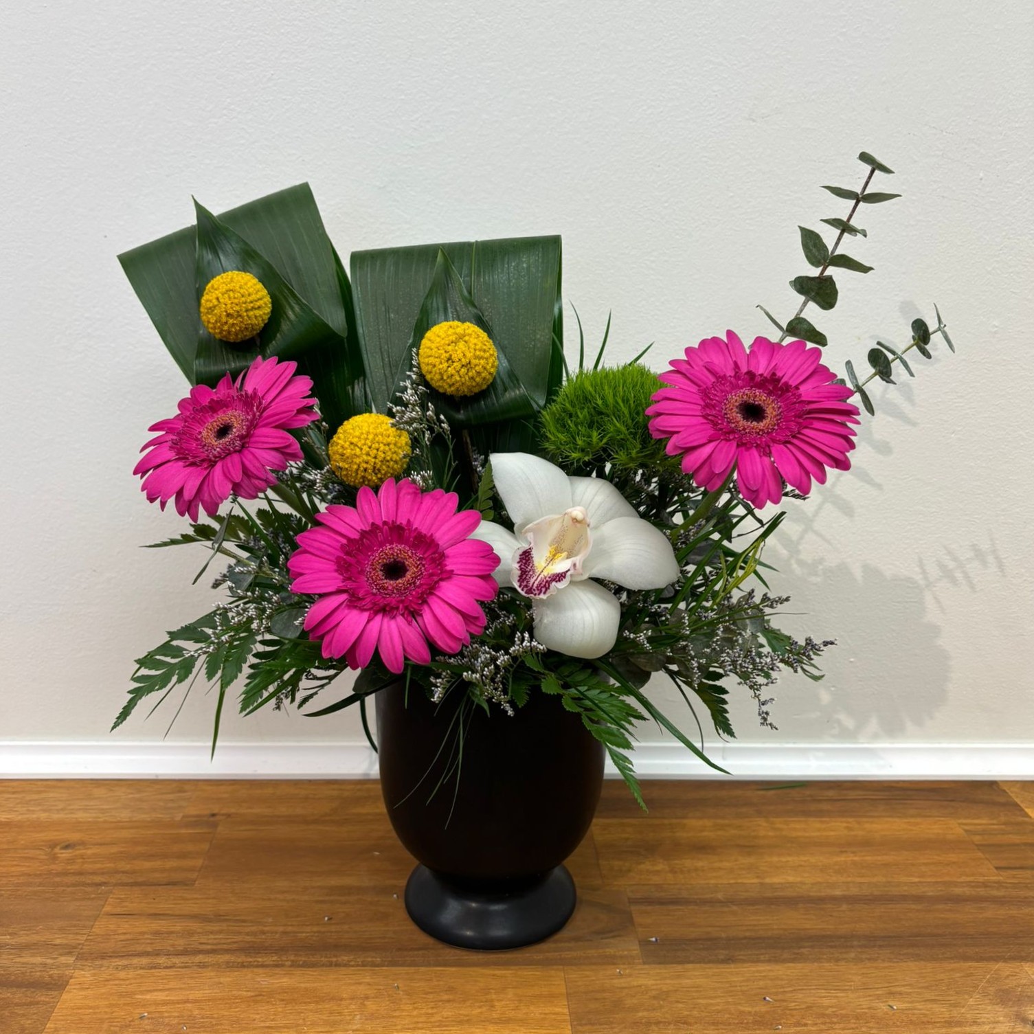 A fresh and stylish design that blends bold colors with elegant details. Featuring vibrant pink gerbera daisies, playful yellow billy balls (Craspedia), and a graceful white orchid, this arrangement is accented with lush greenery and modern foliage. Arranged in a sleek black vase, it’s perfect for adding a pop of color with a contemporary touch.