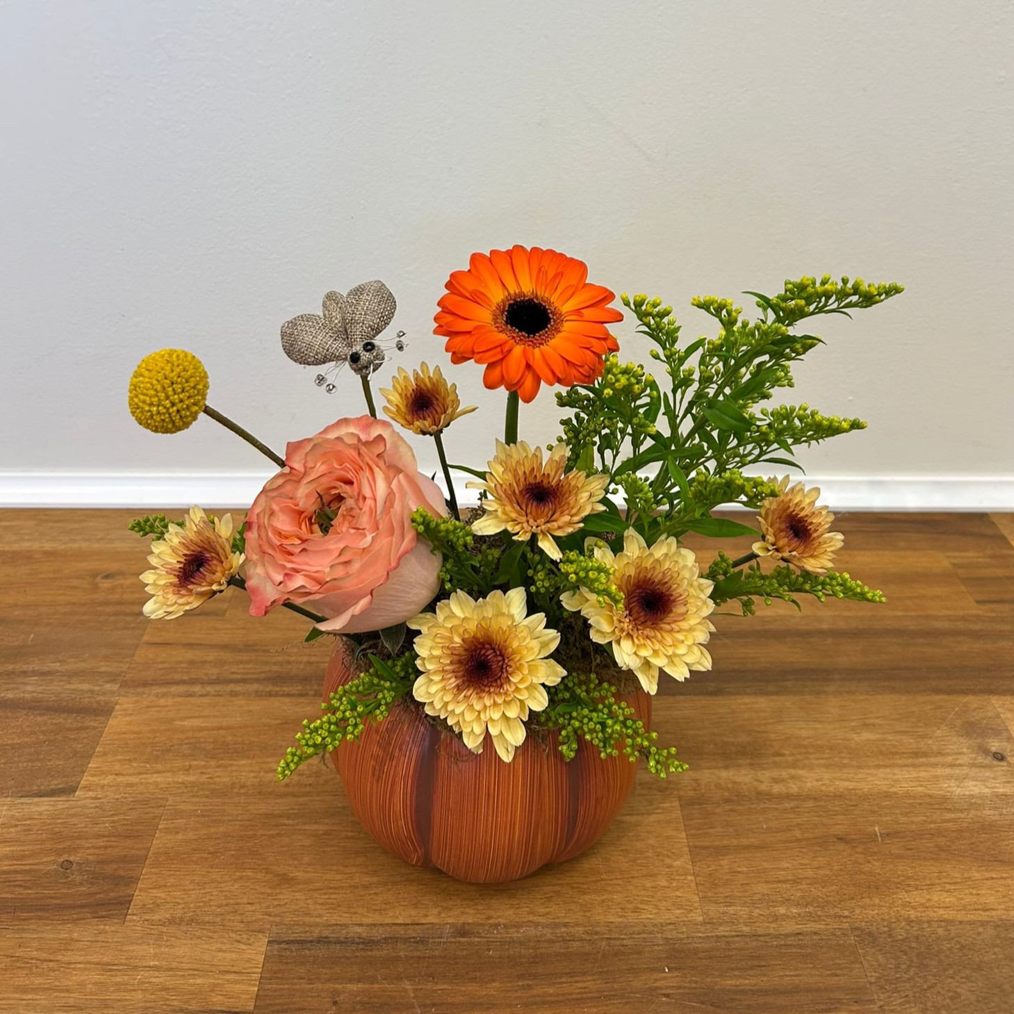 Celebrate the warmth of fall with this charming seasonal design. Nestled in a rustic pumpkin vase, this arrangement features cheerful orange gerbera daisies, soft peach ranunculus, golden-yellow mums, and playful billy balls. Accented with lush greenery and a delicate butterfly detail, it captures the cozy, whimsical spirit of autumn.