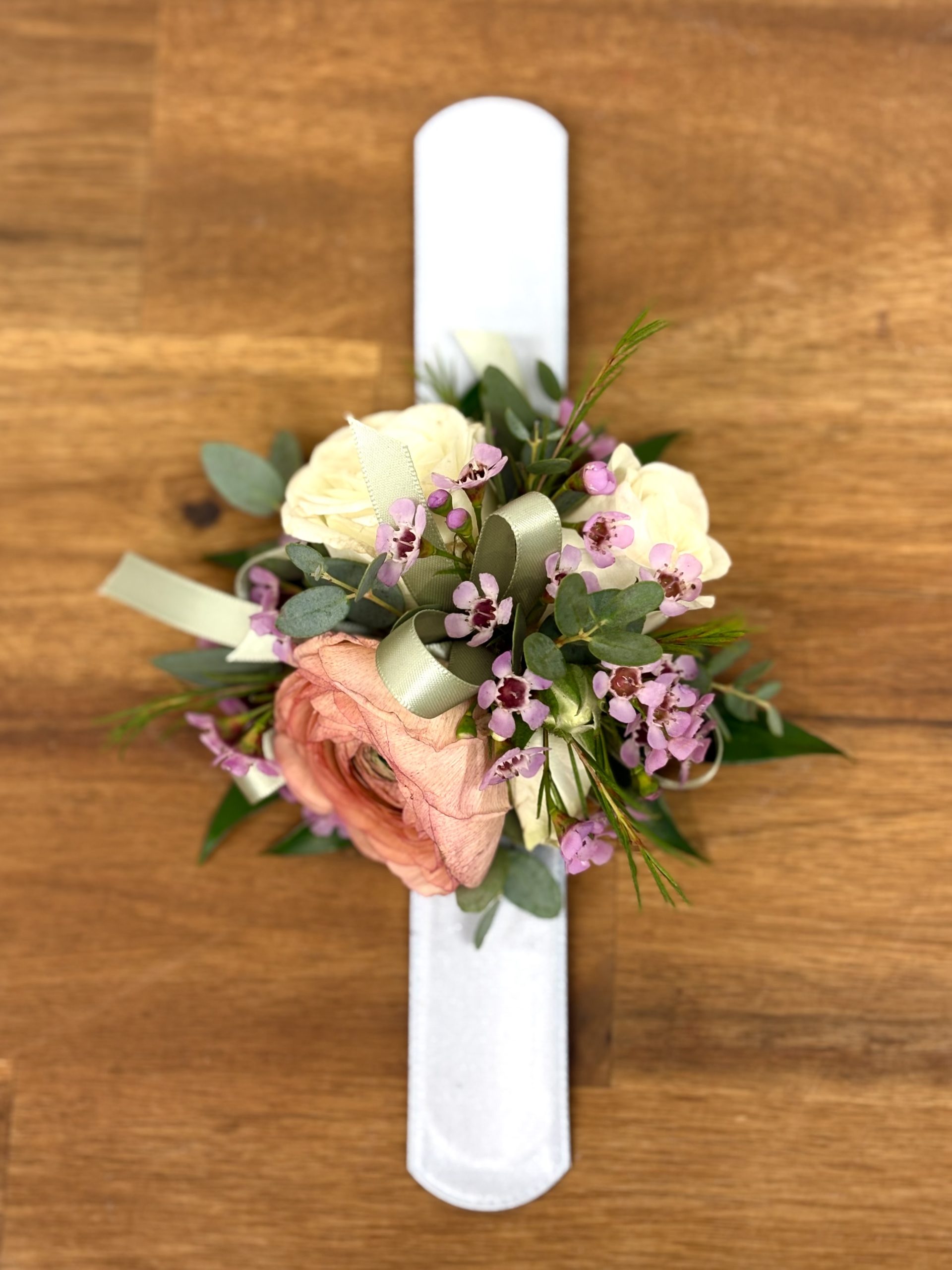 A sophisticated garden-inspired piece featuring a lush, peach-toned ranunculus paired with delicate spray=y roses. Accented with ethereal wax flower and silver-toned eucalyptus, this corsage is finished on a sleek white slap-bracelet for a secure, comfortable fit. Perfect for the guest who values artisanal detail and a modern botanical aesthetic.