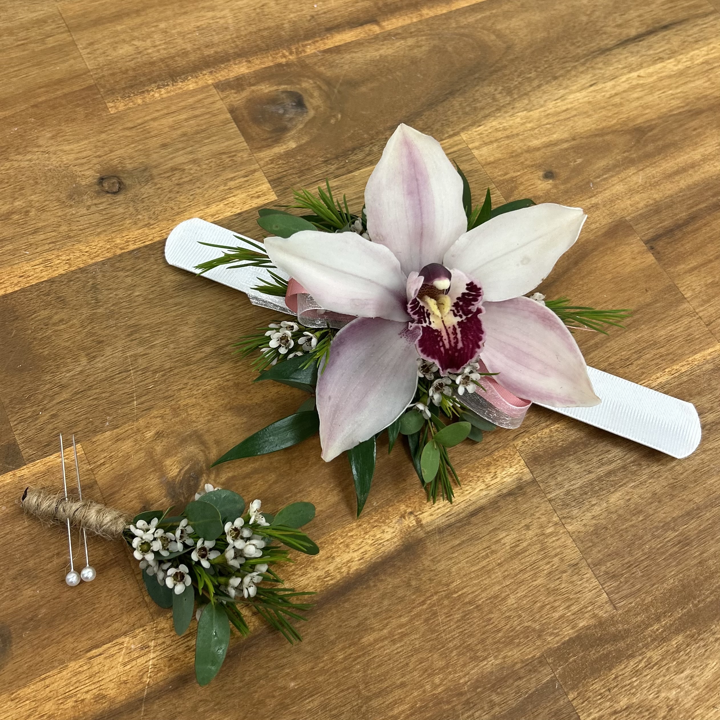 Where tropical luxury meets rustic charm. This set features a breathtaking cymbidium orchid anchored by textural wax flower and rich greenery. The boutonniere is hand-finished with a natural jute twine and pearl-tipped pins, offering an organic yet elevated look for any celebration.