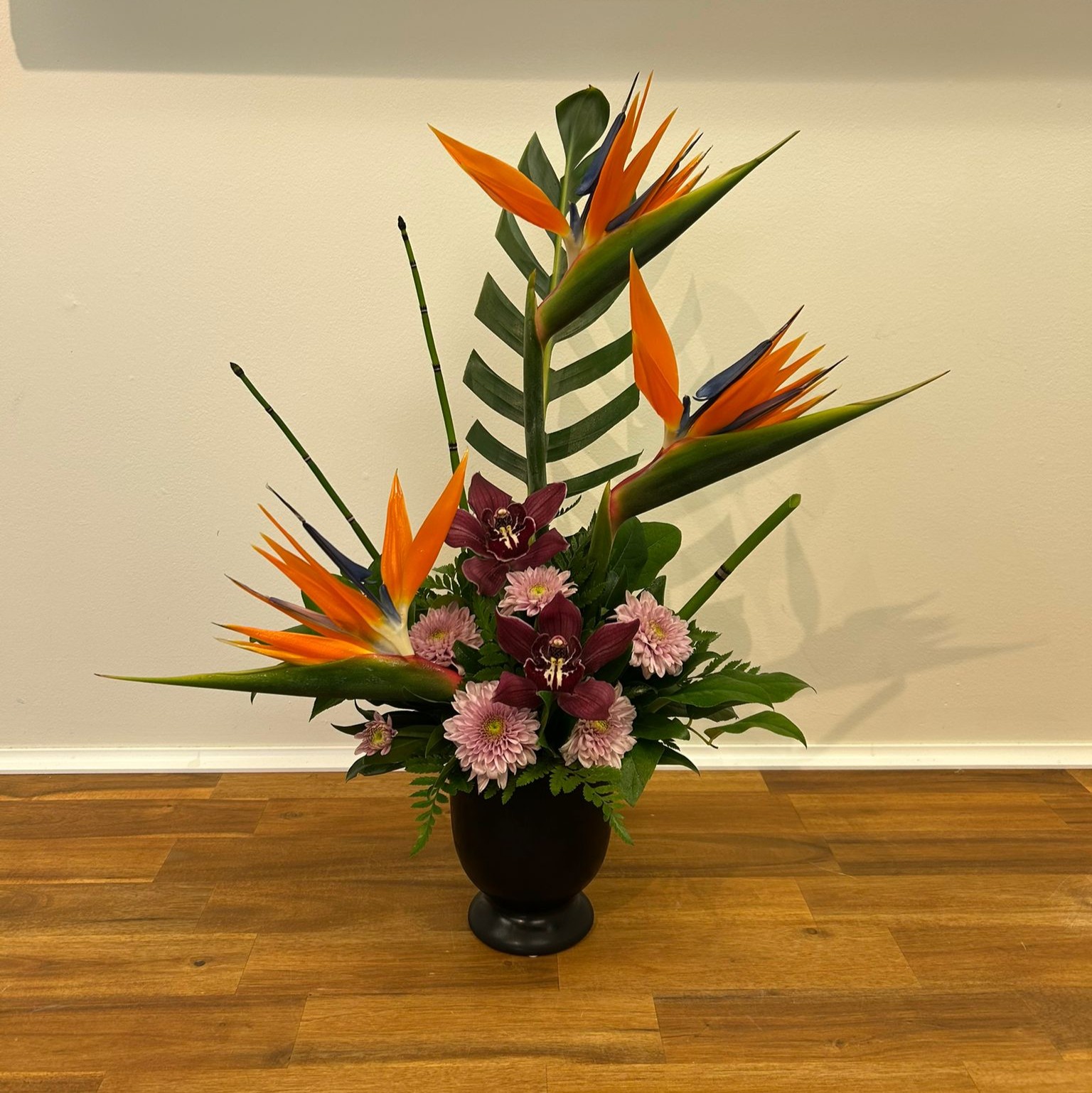 A striking design that brings the beauty of the tropics indoors. This arrangement features bold Birds of Paradise with their vibrant orange and blue tones, symbolizing joy and freedom. Accented with deep burgundy orchids and soft lavender mums, the flowers are set against lush greenery and modern tropical leaves for a dramatic effect.