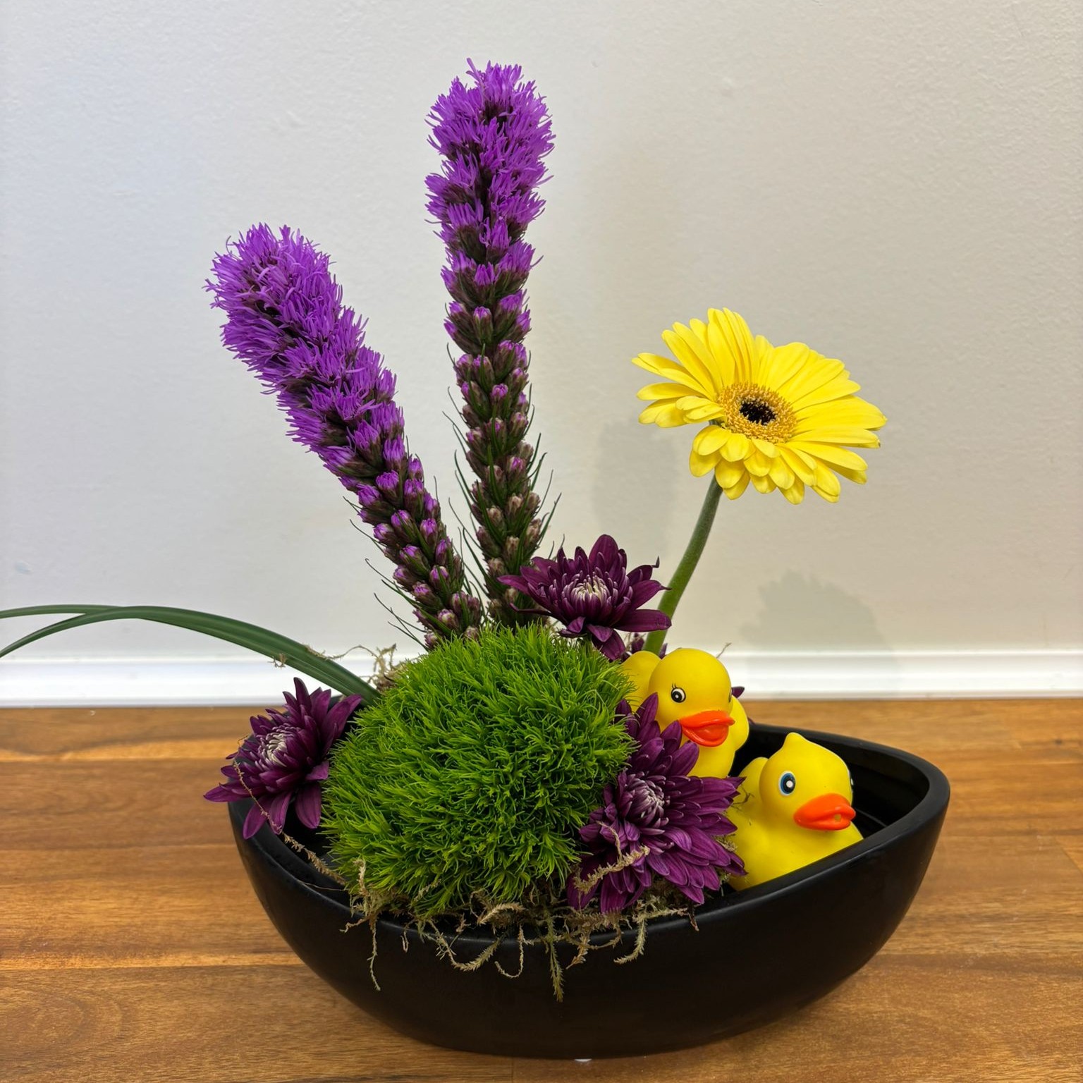 Bright purple liatris stand tall with elegance, while sunny yellow gerbera daisies bring warmth and happiness. Soft moss and deep plum mums add texture and richness, all nestled into a sleek black bowl. Two adorable rubber duckies peek out, adding a whimsical touch that makes this piece especially perfect for welcoming a precious little one.